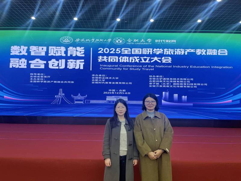 12月6日,以“数值赋能融合创新——构建研学旅游产教融合新生态”为主题的全国研学旅游产教融合共同体成立大会在安徽职业技术大学胜利召开。本次大会由安徽省教育厅、安徽省文化和旅游厅指导,全国研学旅游产教融合共同体主办,旨在汇聚全国研学旅游领域的院校与企业资源,共同探索产教融合新路径、新发展。现代商旅学院旅游管理专业教师吴洁芳和王芳代表学院出席会议。