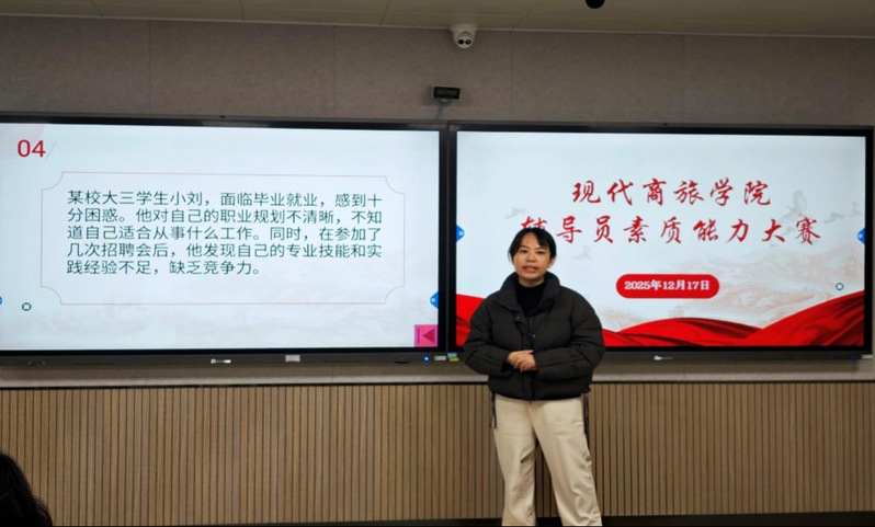 为深入落实立德树人根本任务,切实加强辅导员队伍建设,提升辅导员理论水平、职业能力和专业素养, 12月17日,现代商旅学院在A206教室举办2025年辅导员素质能力大赛选拔赛,全体辅导员同台竞技,展现专业风采。学院党总支副书记刘睿,学工组长岳云玲,团委书记万明月,连锁经营管理教研室主任胡延彦共同担任比赛评委。
