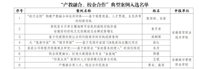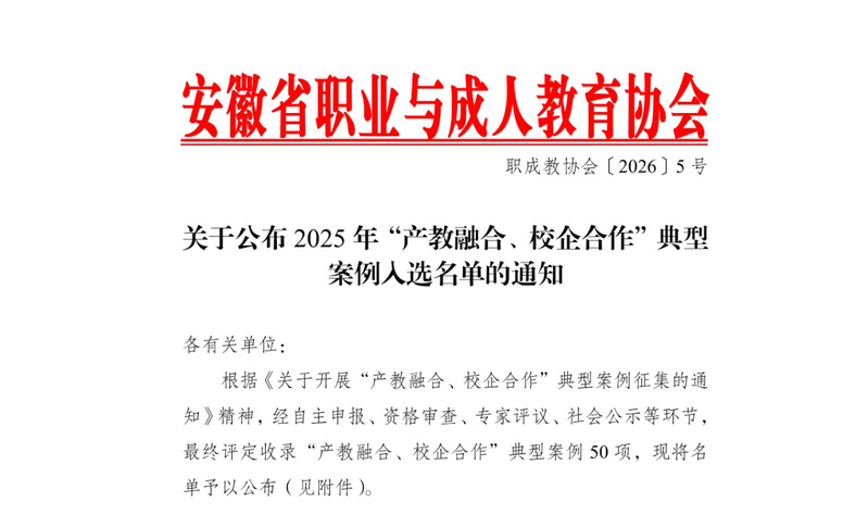 2026年1月21日,安徽省职业与成人教育协会公布了2025年“产教融合、校企合作”典型案例评选结果。我院申报的案例《“四真五双”新商科人才培养模式探索与实践》成功入选,充分体现了我院在深化产教融合、创新校企合作方面的扎实成效与广泛探索。